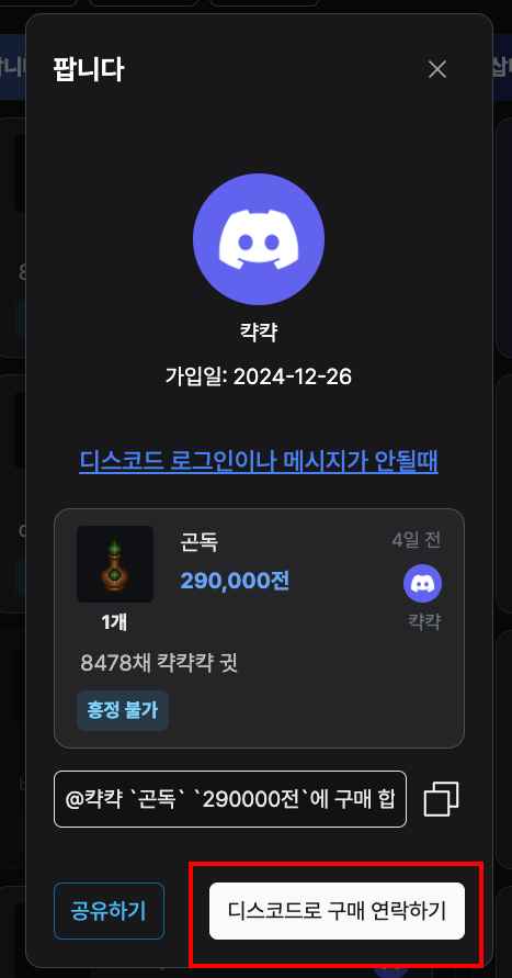 2. 디스코드로 판매/구매 연락하기 혹은 파티 연락하기 > 클릭